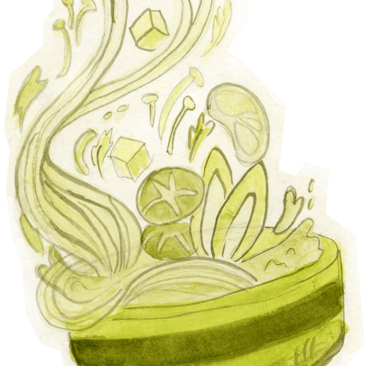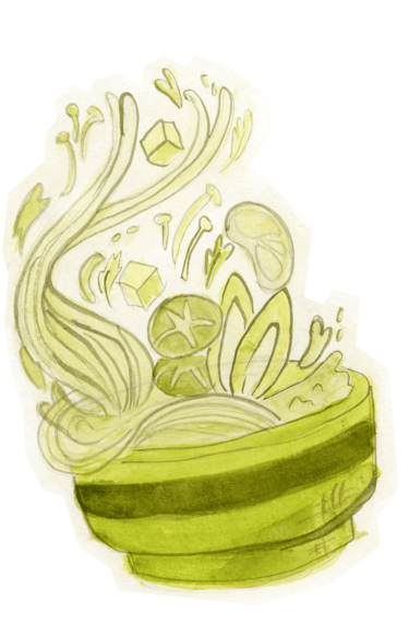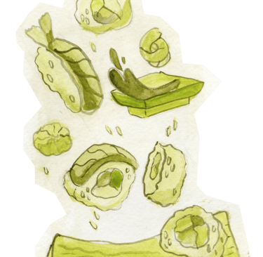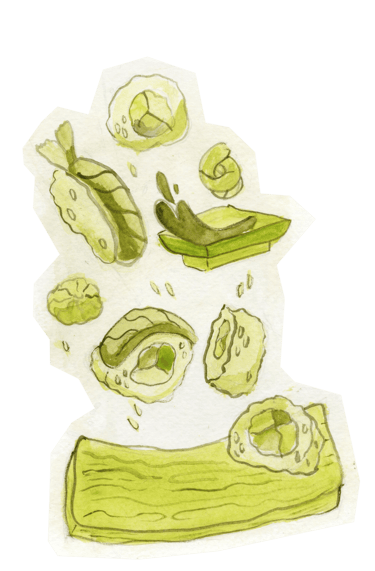 A sketch was created to capture the movement and energy of tossed food, then enhanced using watercolor in a monochromatic palette to maintain visual cohesion. The piece was later refined in Photoshop to better match the intended tone and atmosphere of the overall design.